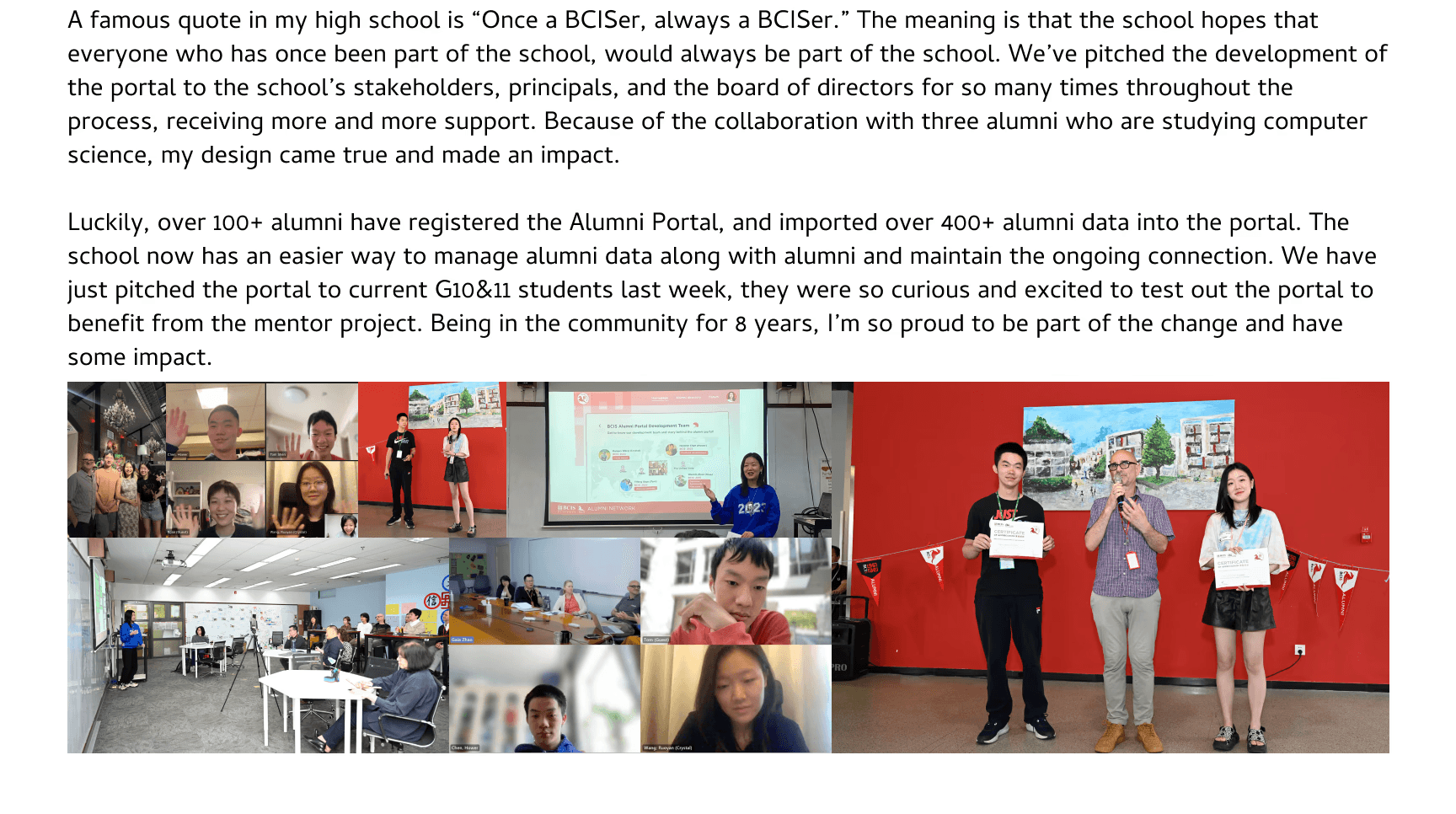 The portal is currently used by over 100 alumni and 100 current high school students as a platform to build deeper connection through supporting and communicate with each other.