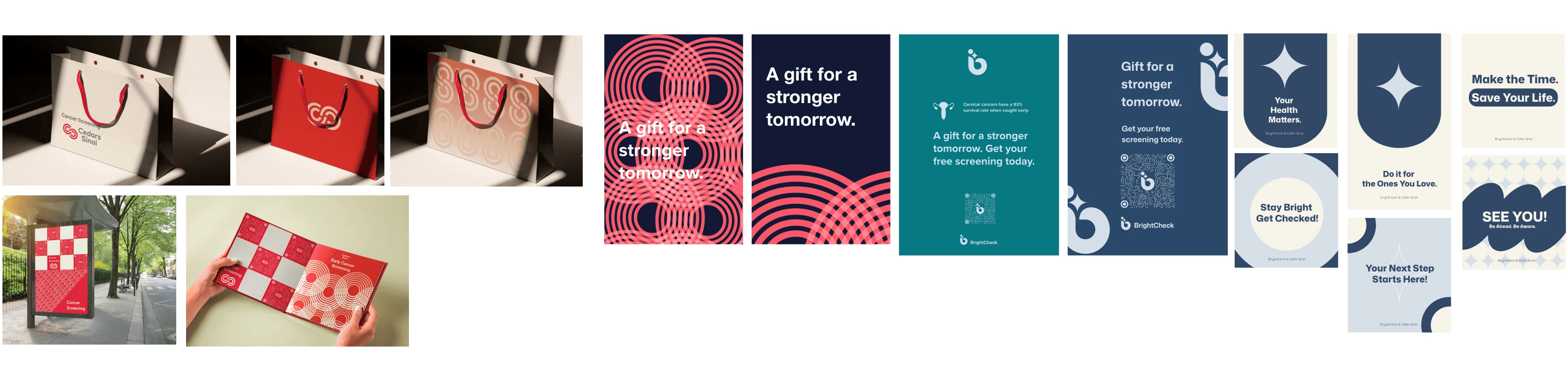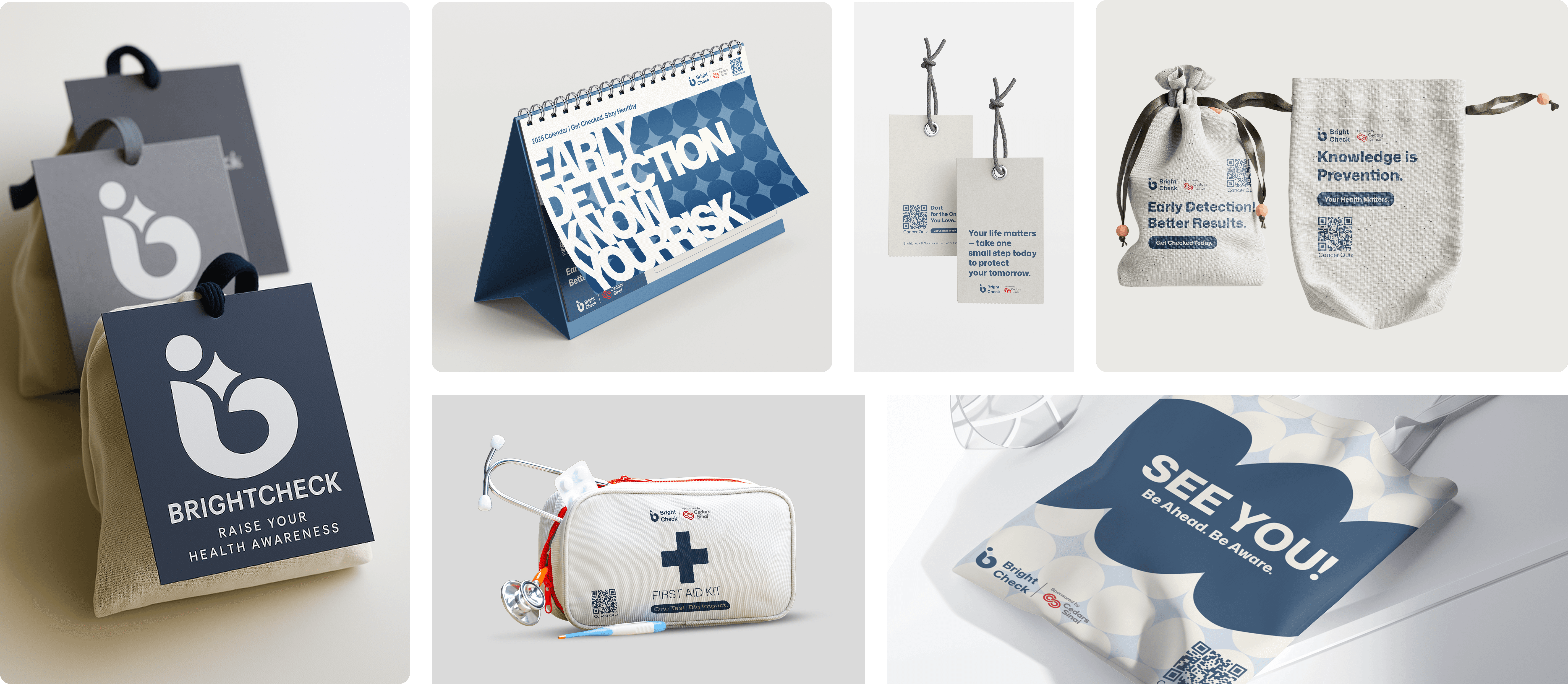 Early concepts included traditional merchandise such as bags and notebooks. The direction later shifted toward items that better fit into people’s daily routines and support different stages of the screening journey, including short-term reminders before screening and objects that encourage long-term health awareness. The visual direction also evolved from closely resembling Cedars-Sinai’s style to focusing on imagery that more clearly represents cancer screening itself.