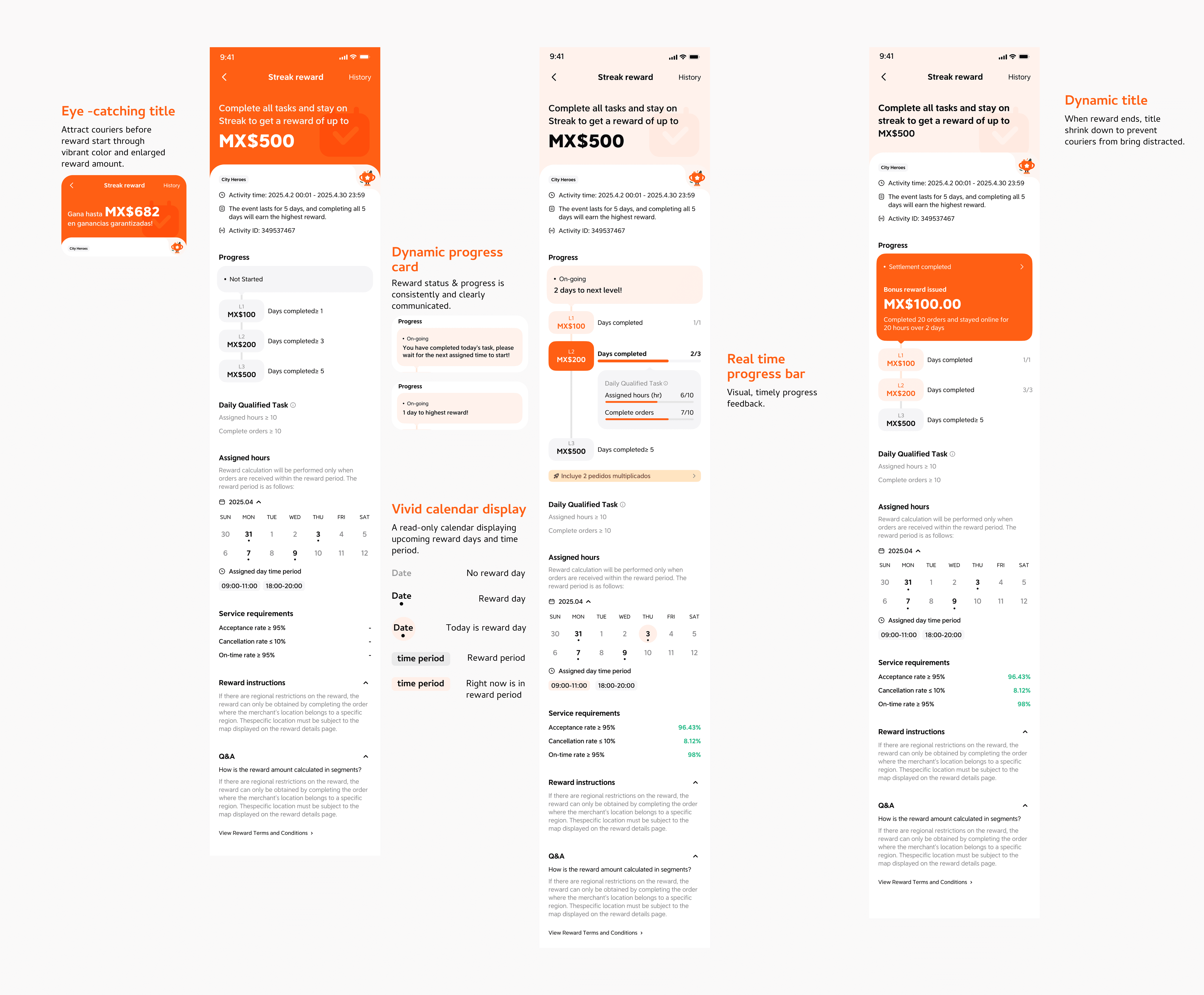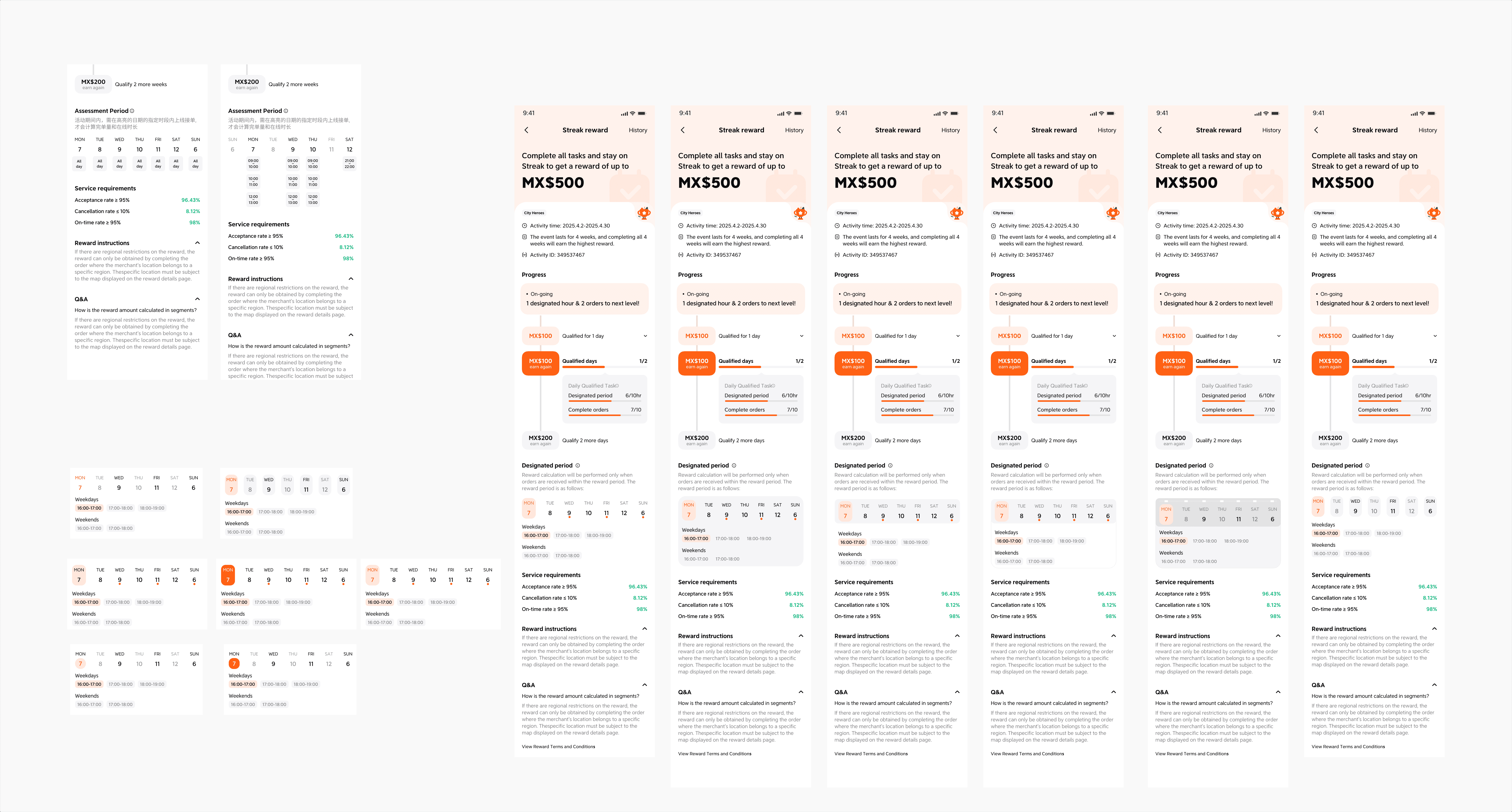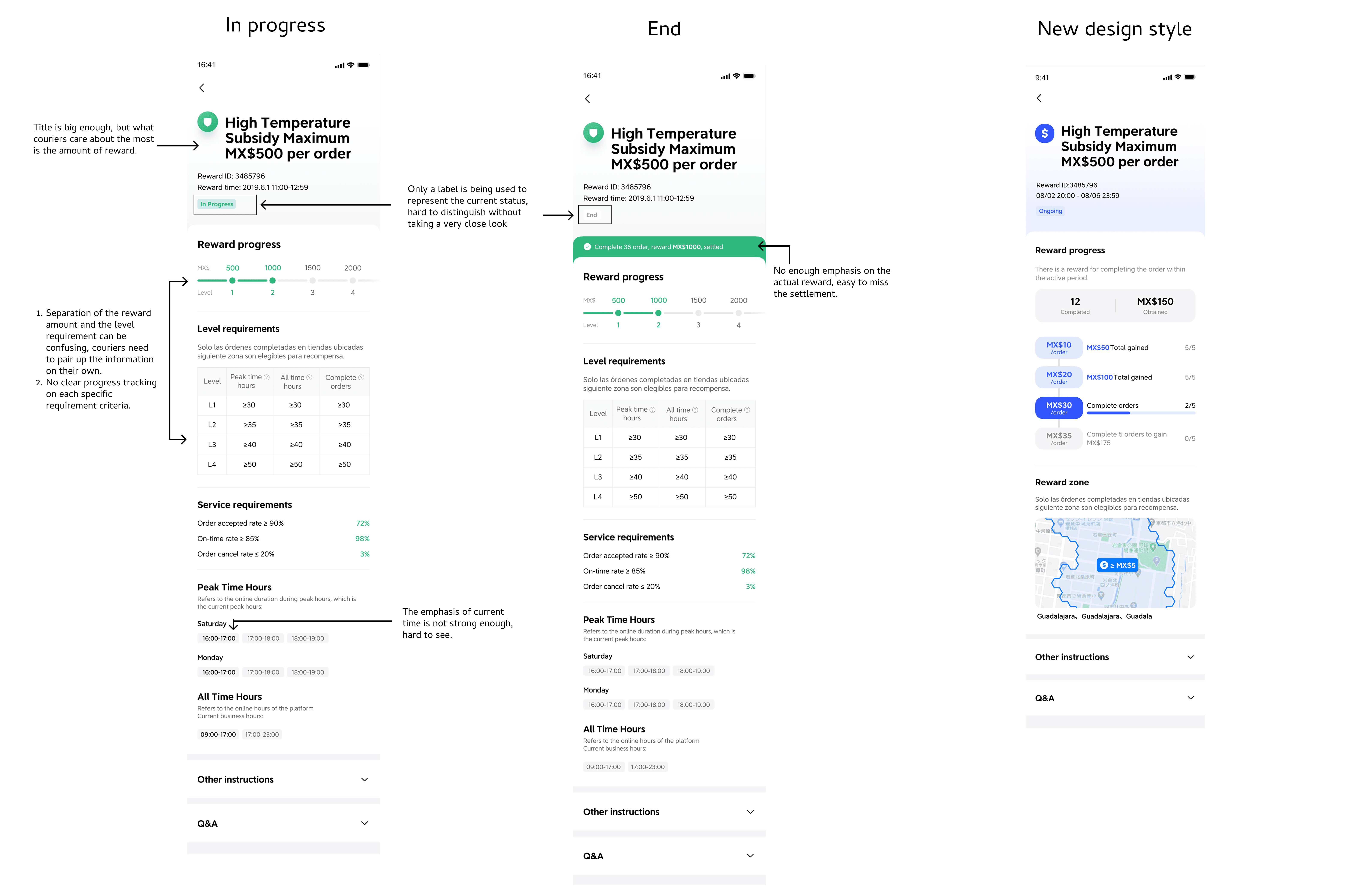 During my internship, I worked on optimizing the courier experience for the Latin American market. Independently designed the interaction solution for multiple features, including "courier incentive", "grocery picking", "food delivery experience" and etc, focusing on simplifying core workflows and improving usability.