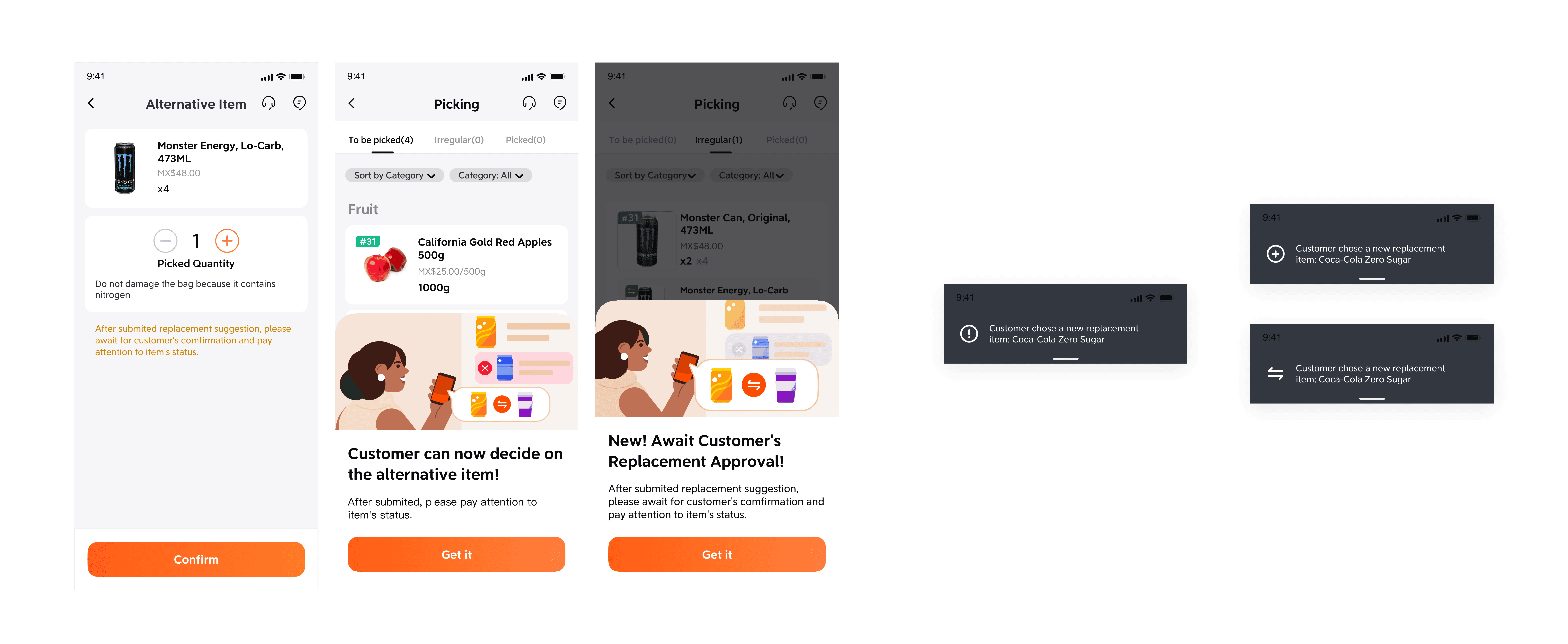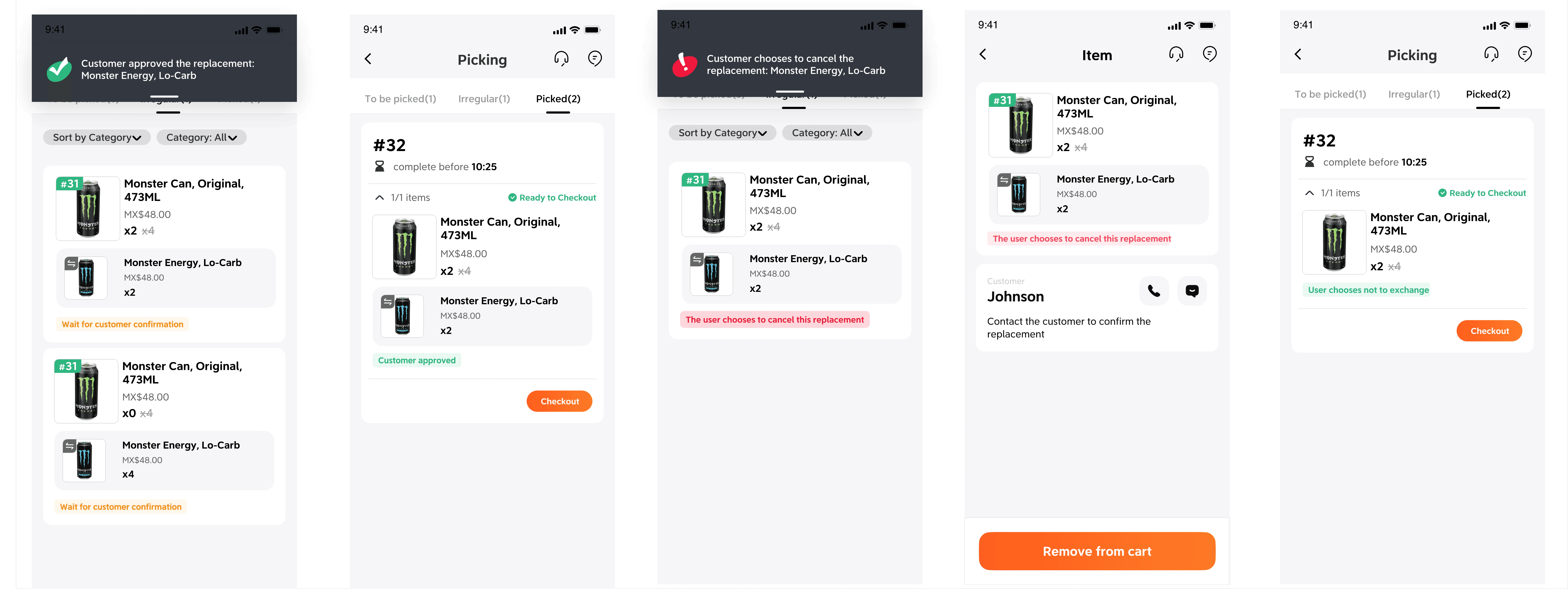In out-of-stock cases, riders can suggest replacements, but users can’t modify — only accept or reject.