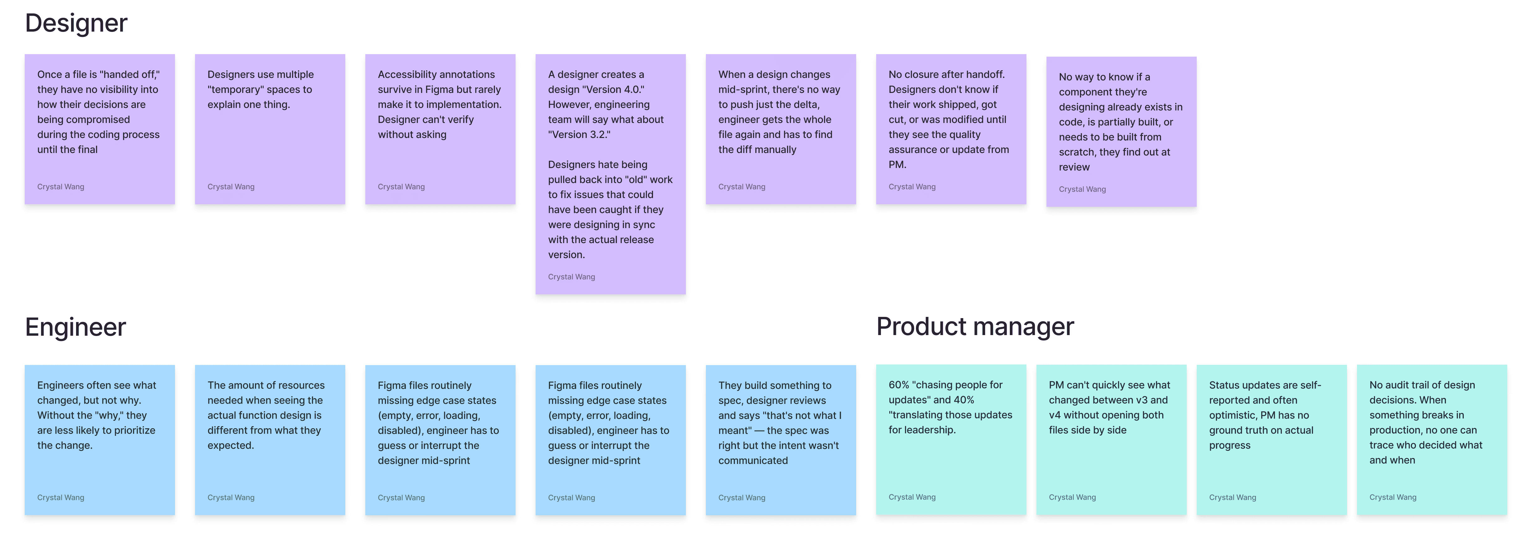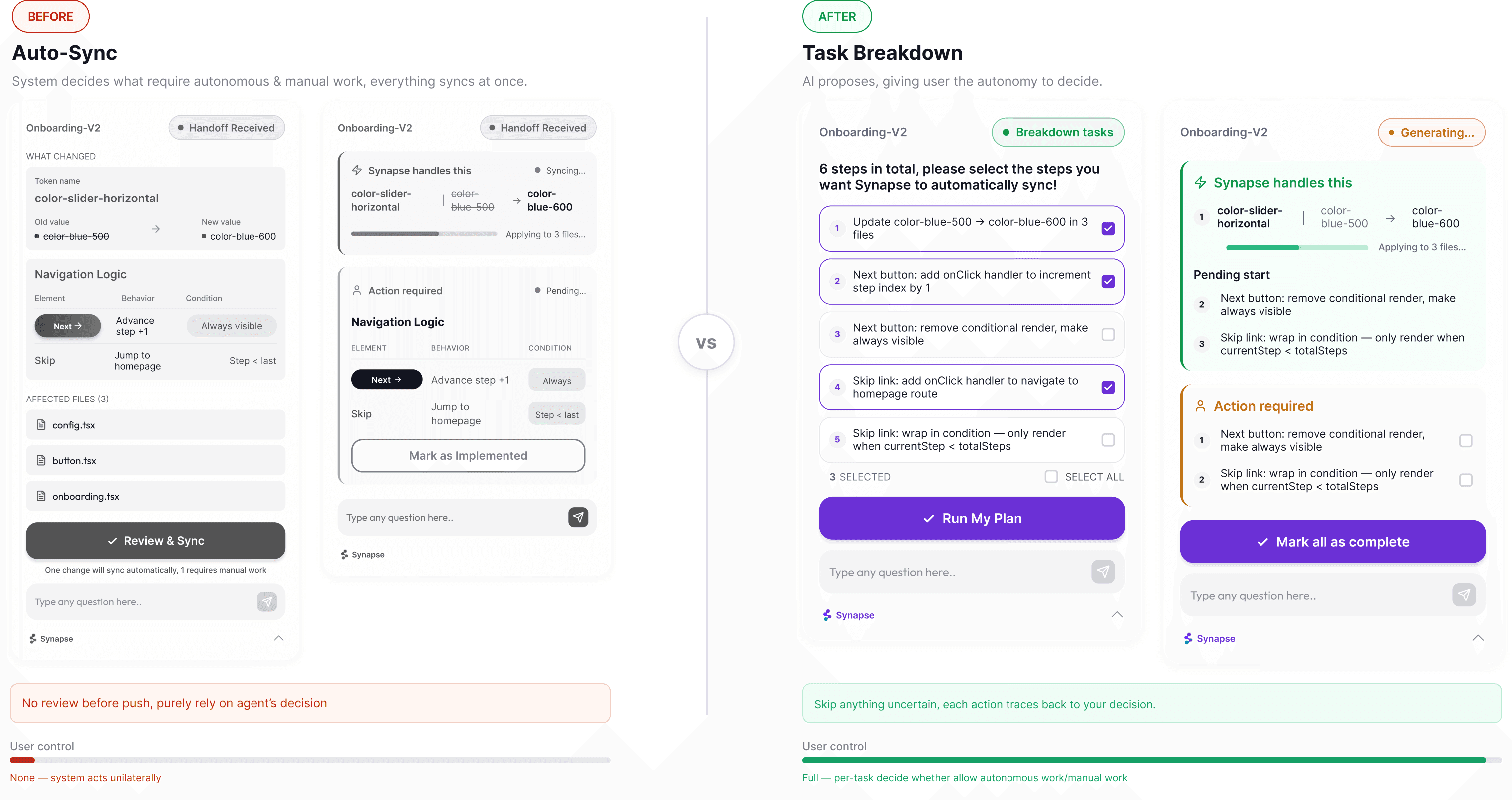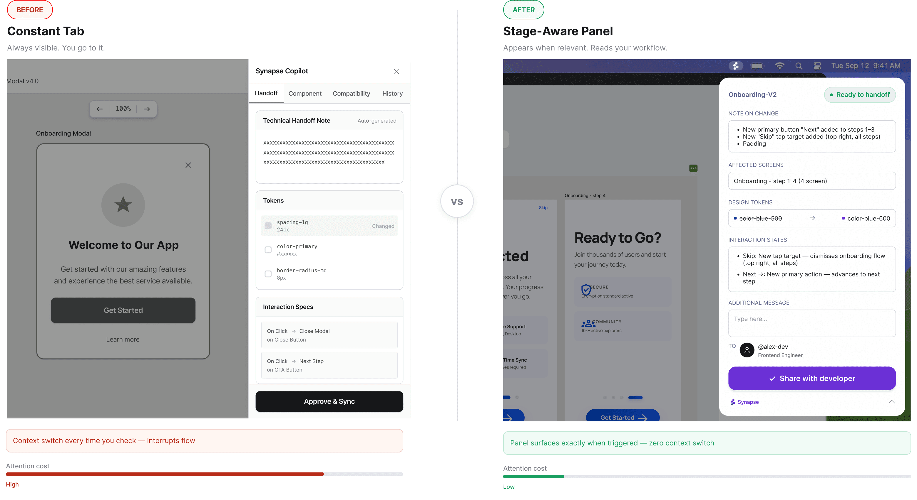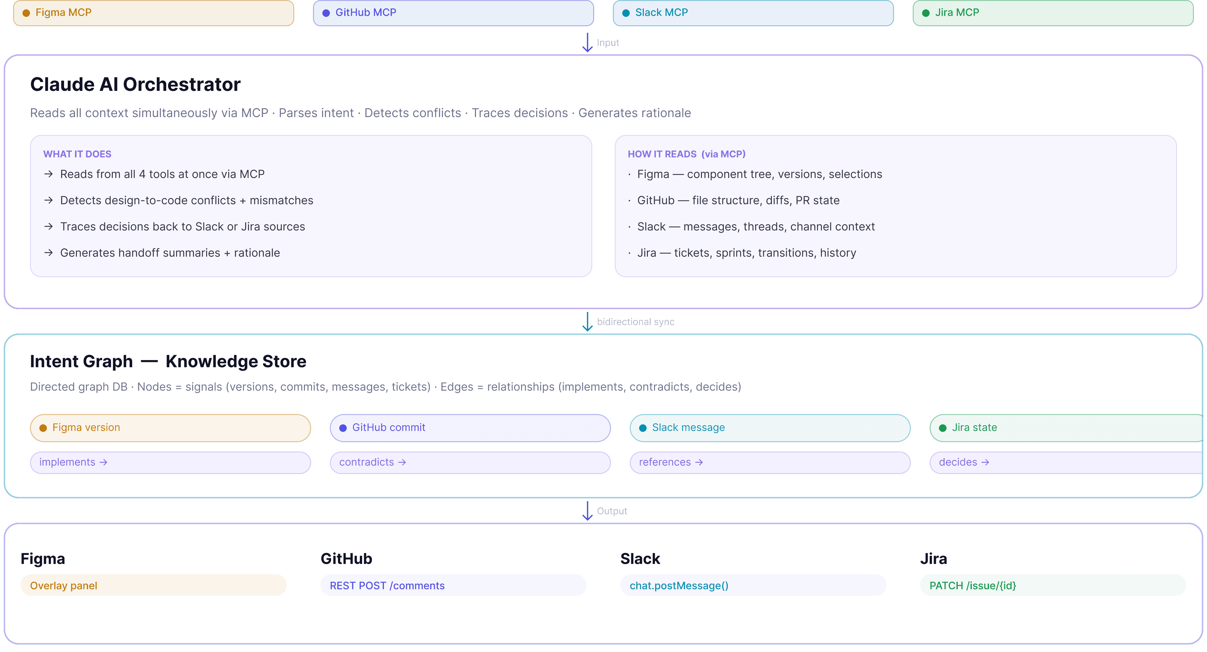 A coordination layer that integrated across the cross-functional ecosystem—from design canvases and communication hubs to the developer stack. By transforming ambient team intent into technical action, Synapse eliminates the manual documentation tax to ensure design vision and production never drift apart, improving efficiency.