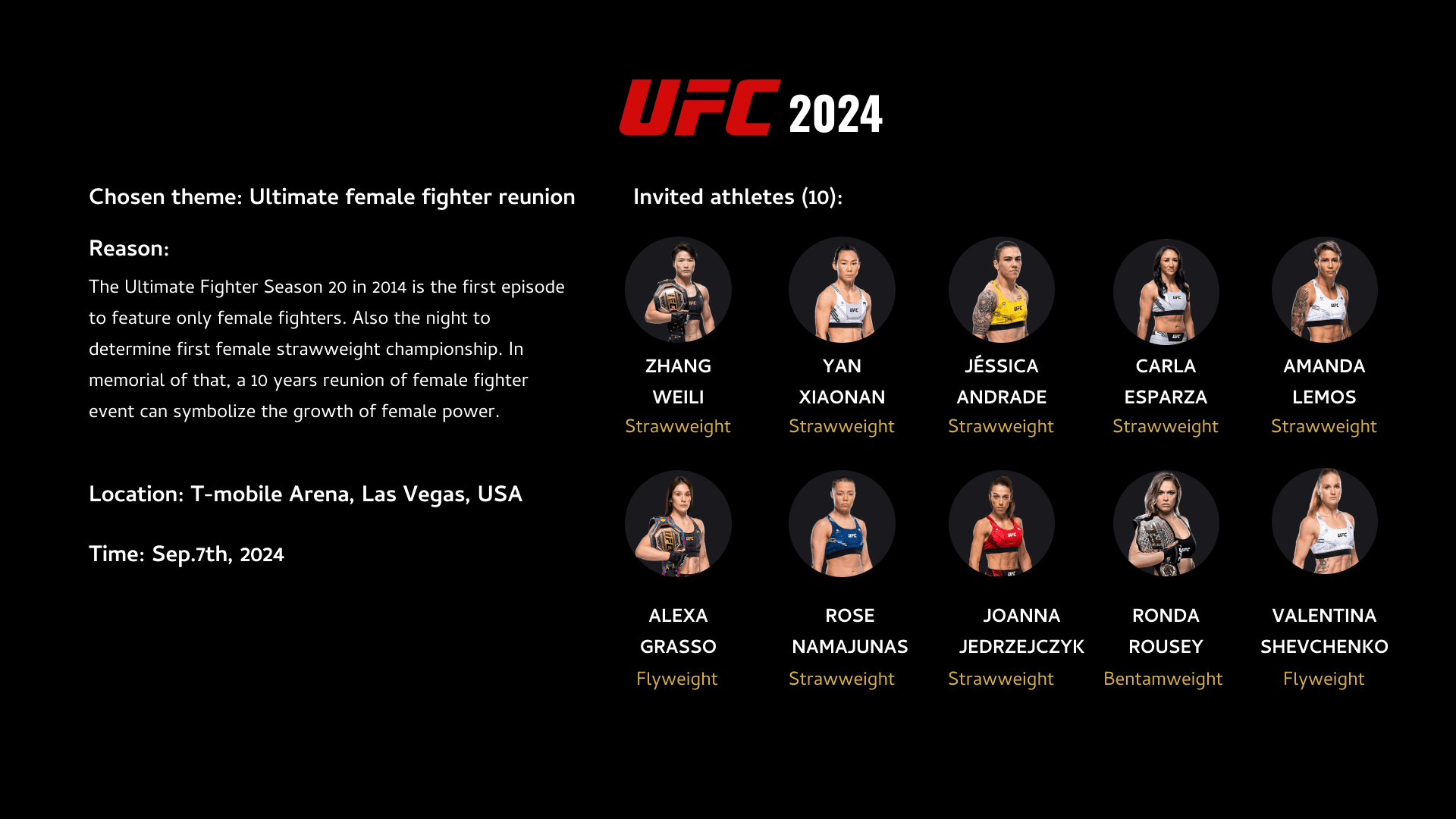 A event website design named as Ultimate female fighter reunion for UFC. UFC has a documentary name the ultimate fighters and the Ultimate Fighter Season 20 in 2014 is the first episode to feature only female fighters. 2024 is the tenth year from 2014, this is a imagined event planning aims to celebrate the extraordinary route of all female athletes with in the last 10 years.