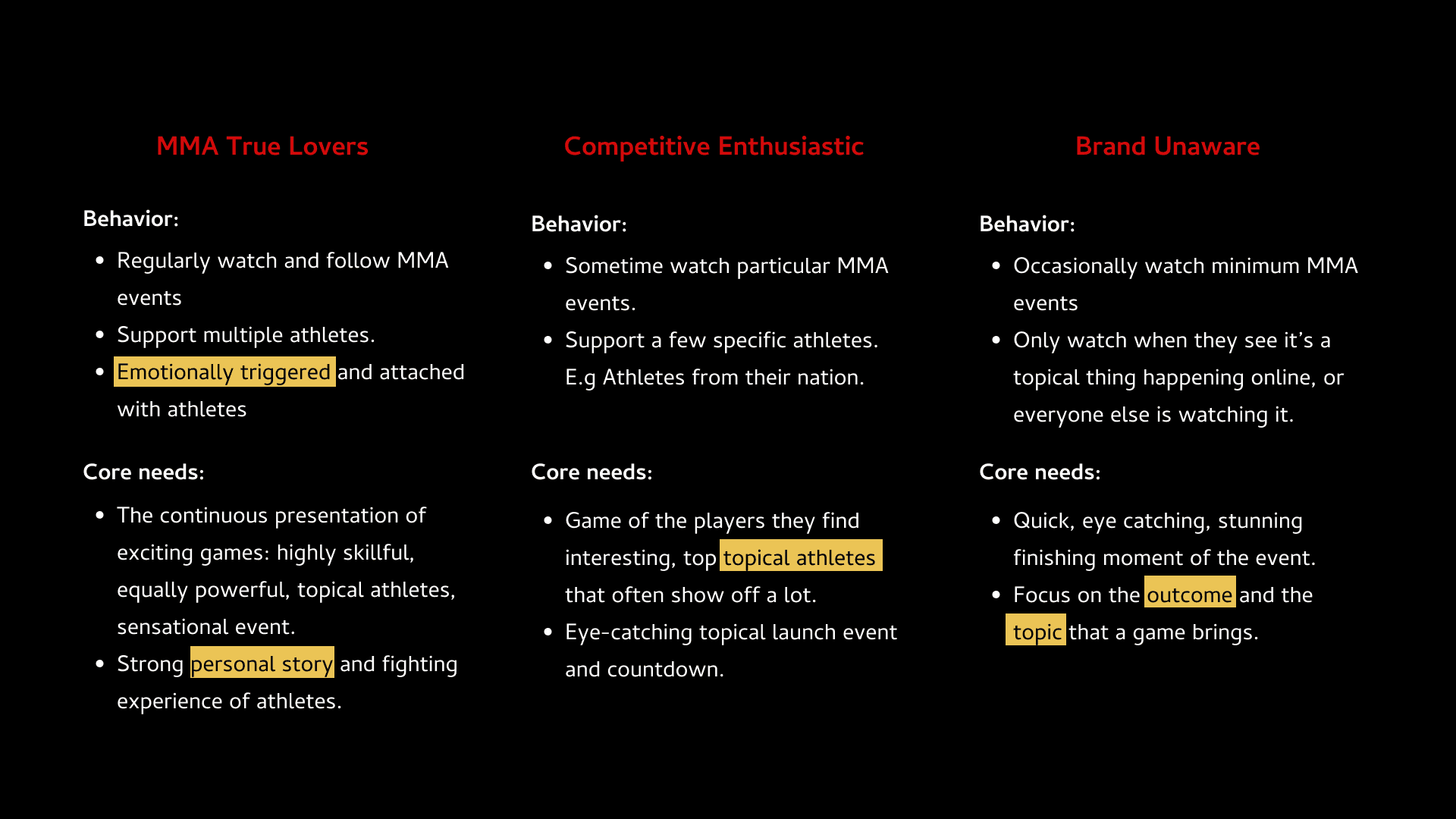 After several interviews, 3 user archetypes was created. Ideas of topical athletes with heart-touching personal story is what a lot of audiences care about the most.