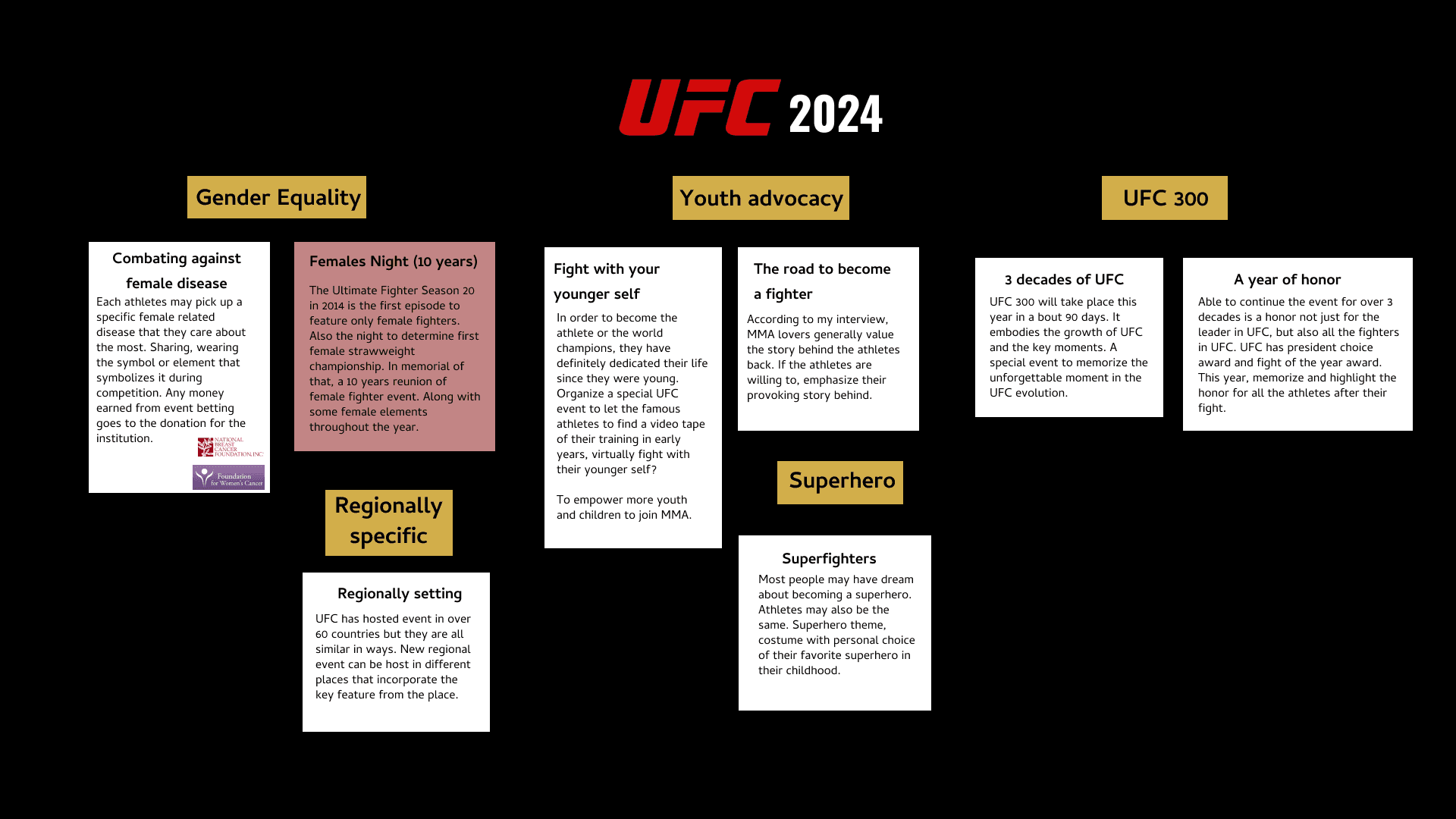 From there, I did a affinity map on the potential themes through highlights UFC's social commitment and what may be most meaningful to the brand and the audience.